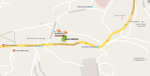 Vous prenez la route qui mène à la route nationale numéro 2, du point de départ au collège Protestant RASALAMA. Vous dirigez sur la rue Foloalindahy Malagasy. Roulez environ 800 mètres tout droit, puis vous rencontrez le chemin qui conduit vers l' Hôpital Militaire ( ex Girard & Robic) ou Rue Gilbert Desvallons, tournez à gauche, puis ,suivez cette ruelle. Après un parcours de 200 mètres vous apercevriez du côté droit un arrêt de bus et vous saisissez directement le panneau Hibiscus qui vous conduit jusqu'à nous.